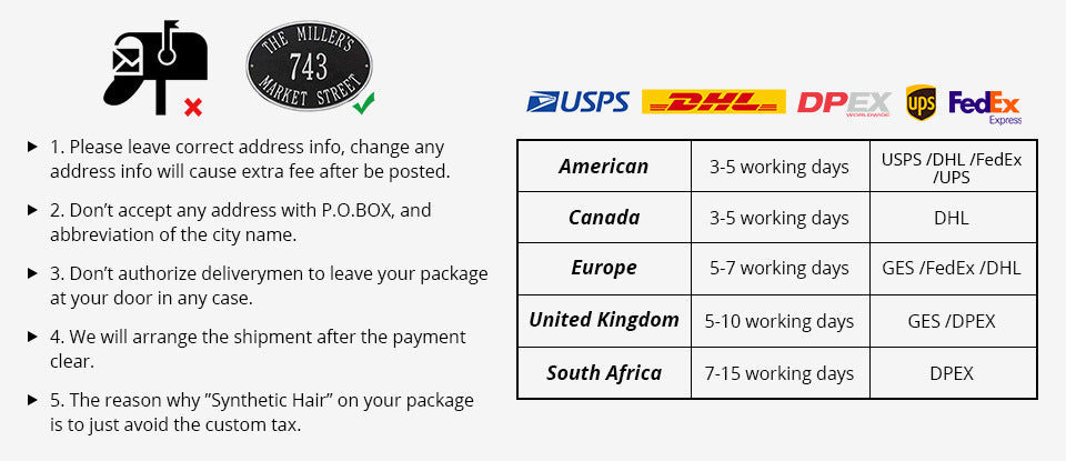 We offer worldwide shipping with fast delivery. Usually, orders are shipped within 24 hours, (excluding customized or colored wigs). Note: If you need to specify the shipping carrier, please contact customer service.